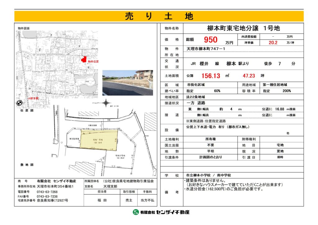 | 物件名 | 天理市柳本町 宅地分譲 1号地 | ||